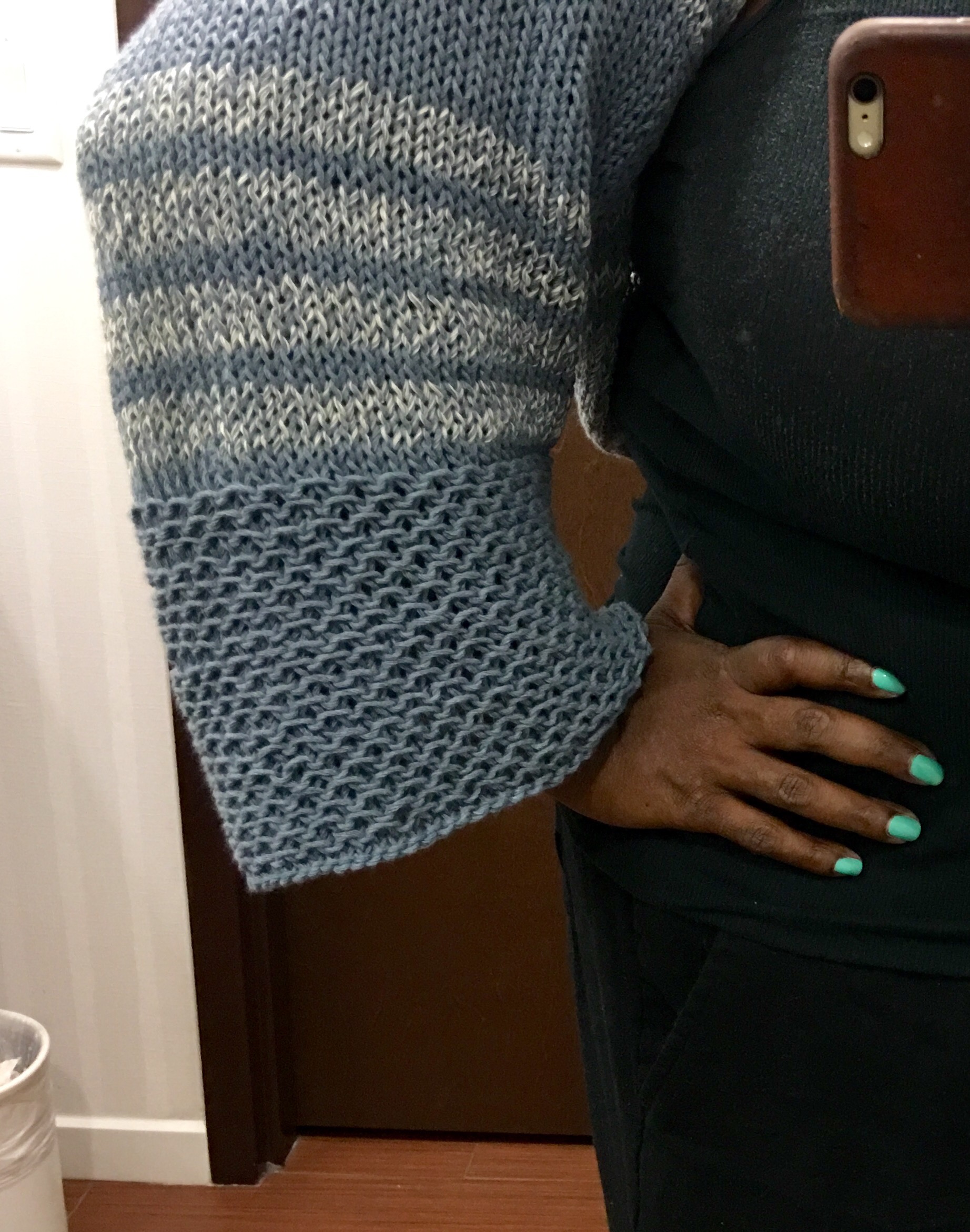 As you all know I was gifted the fabulous Billie Jean Yarn from Wool and the Gang and I made the Pop Life Cardigan (that gets a post of it’s own). Well I also had some extra because well they are AWESOMENESS!!! So I searched Ravelry and found the Verdant shrug by Gina Bonomo aka SkeinCocaine. The yardage was right and the shrug is super cute. You all know I love texture and this project gave me a new stitch to obsess over. The stitch is calledRich  Man’s Garter Stitch, I loved it so much I did a YouTube video. Check it out hereÂ