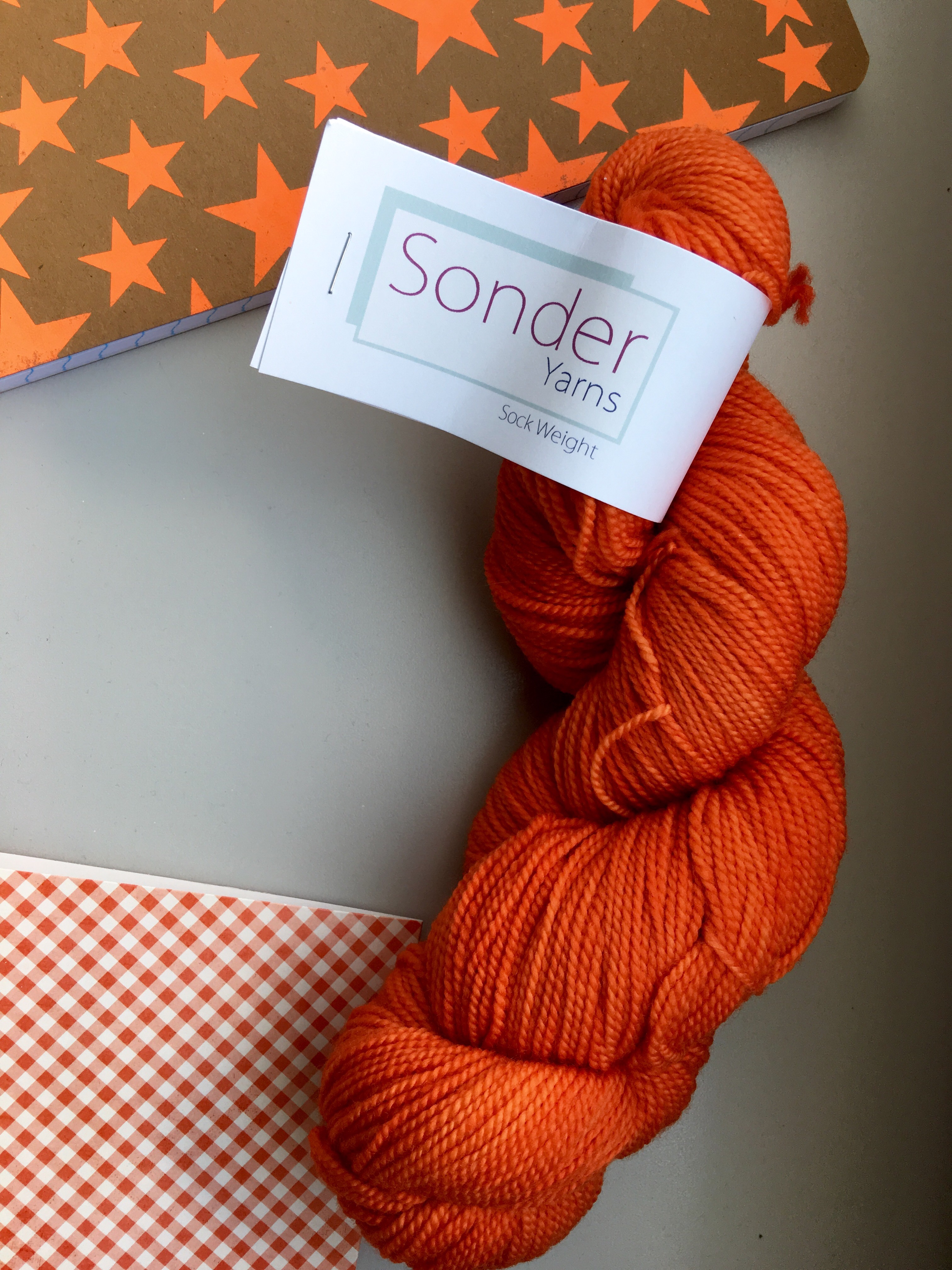 But when that was done then what? Life has been tough,last week  my car was stolen back at home and I have a full on cold ugh!! I need to knit to stay sane. Then the fiber Gods smiled down on me, yup they did! Sonder Yarns sent me some ORANGE sock weight yarn…all I right with the world! Yea it is!